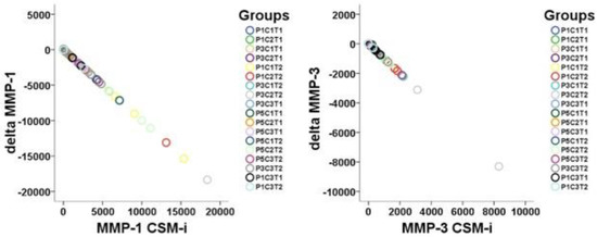 Overall, MMP-1 and MMP-3 showed the highest expression when lower cell passage was combined with longer membrane-holding time, i.e., P1 combined with T2. An overview of in vitro/in vivo (CSM-i NS CSM-e) proteinase expression patterns (MMP-1 AND MMP-3) showing the effect of cell passage (P) and membrane-holding time (T) is presented in Figure 3.