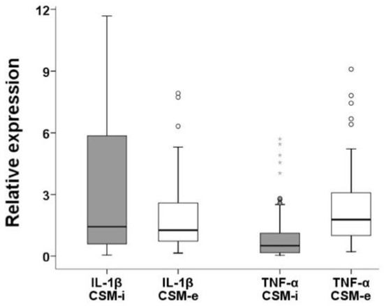Figure 5. Relative expression levels of pro-inflammatory cytokines (IL-1β and TNF-α) comparing CSM-i to CSM-e. Outliers are marked separately with *.