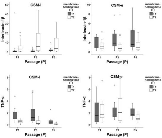 Figure 6. Expression patterns of IL-1β and TNF-α within in vitro (CMS-i) and in vivo (CMS-e) membranes subdivided by cell passage 1 (P1), 3 (P3), and 5 (P5) and membrane-holding time 5 h (T1) and two weeks (T2). Outliers are marked separately with *.