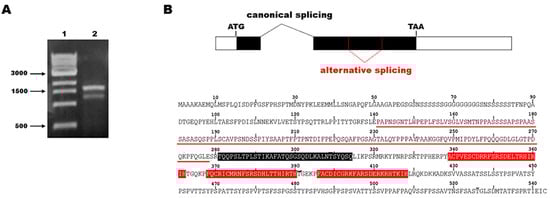 With the aim to clone the entire coding region of the transcription factor EGR1, we designed PCR reactions using a pair of primers spanning from the start codon to the stop codon based on the mRNA sequence reported in the National Center for Biotechnology Information (NCBI) database (NM_001964.2). As a template, we used a cDNA sample obtained by the retrotranscription of RNA extracted from the SH-SY5Y neuronal cell line differentiated by retinoic acid (RA). The PCR reaction products were subjected to gel electrophoresis and, surprisingly, we found two different amplicons—one of the expected size and the additional one with a smaller size relative to the first (Figure 1A).