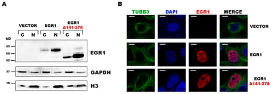 We isolated and cloned both gel bands to identify the corresponding sequences. As expected, the amplicon with the highest molecular weight corresponded to the entire coding sequence of EGR1 reported in genome databases; however, the smaller amplicon corresponded to the EGR1 transcript lacking a central region of 414 bases in length in the coding DNA sequence (CDS) (Figure 1B). The bioinformatic translation of the alternative EGR1 isoform, hereafter named EGR1 Δ141–278, showed that it retained the correct frame and encoded for a shorter protein compared to the canonical EGR1 (Figure 1B). The absence of this region does not alter the ability of the protein to translocate into the nucleus. In fact, we analyzed the cellular localization of the protein after transfection of expression vectors for both the canonical and alternative EGR1 isoforms in HEK293T cells. Western blotting experiments on nuclear and cytoplasmic fractions showed that the EGR1 Δ141–278 isoform preferentially displayed nuclear localization (Figure 2A), as corroborated by immunofluorescence analysis (Figure 2B).