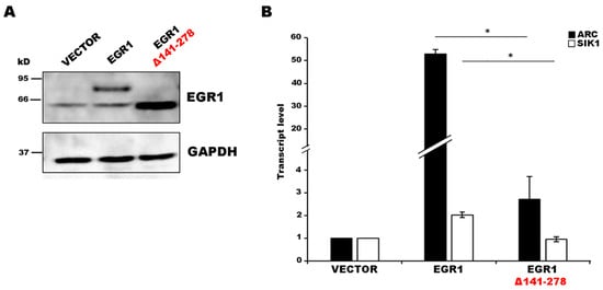 Expression pattern comparison in EGR1 and EGR1 Δ141–278 iper-expressing cells. (A) Analysis of the isoforms iper-expression in HEK293T cells transfected with both EGR1 constructs and an empty plasmid by Western blotting. The level of Glyceraldehyde-3-phosphate dehydrogenase (GAPDH) protein was used as a loading control. (B) Expression level change for activity regulated cytoskeleton associated protein (ARC) and salt inducible kinase 1 (SIK1) transcripts in EGR1 and EGR1 Δ141–278 iper-expressing cells. Gene expression level was normalized to the reference transcript GAPDH and calculated with the 2−ΔΔCt method. The sample transfected with the empty vector was used as a calibrator. The results from independent biological replicates were expressed as the mean of fold change ± SEM (standard error of the mean). Statistical analysis of the qPCR data was carried out using a two-tailed t-test. Significance of difference in fold change (* p < 0.05) is shown.