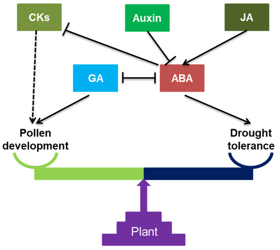 Interactions between hormones in regulating pollen development and drought tolerance. Dashed arrow: indirectly promote; solid arrow: directly promote; and T-bar: restrain.