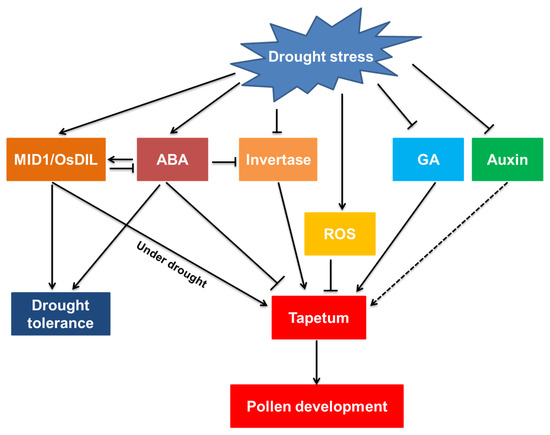 Model of the effect of drought stress on pollen development. Dashed arrow: indirectly promote; solid arrow: directly promote; and T-bar: restrain.