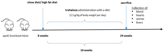 Thus, the aim of our study was to comprehensively describe the influence of a 16-week treatment with orally administered trehalose on the progression of atherosclerotic lesions and hepatic steatosis in apoE−/− mice in an experimental set-up reflecting both moderate and severe proatherogenic conditions: in male apoE−/− mice on a chow diet (CD) and female apoE−/− mice fed with a high-fat diet (HFD) to determine whether oral administration of this disaccharide and under what conditions might affect atherosclerosis and hepatic steatosis.