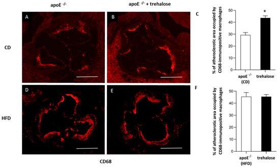 Macrophage infiltrated in the atherosclerotic lesion of trehalose-treated apoE−/− mice. Immunohistochemical staining of aortic roots showing CD68-positive macrophages (A,B,D,E) in apoE−/− mice on a CD (A), trehalose-treated apoE−/− mice on a CD (B), apoE−/− mice on an HFD (D), and trehalose-treated apoE−/− mice on an HFD (E). Quantitative analysis of atherosclerotic lesions areas occupied by CD68-positive macrophages in apoE−/− mice and trehalose-treated apoE−/− mice on a CD and an HFD (C,F) (mean ± SEM; * p < 0.05 as compared to apoE−/− mice on a CD; n = 7–11 per group). Scale bars = 500 µm.