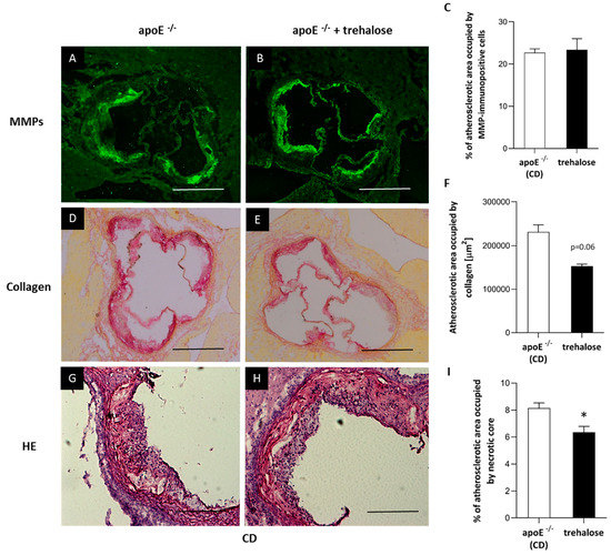 Content of metalloproteinases, collagen and necrotic core in the atherosclerotic lesion of trehalose-treated apoE−/− mice. Immunohistochemical staining showing non-specific activity of gelatinases (mostly MMP-2 and MMP-9) (A,B), total collagen (D,E) and necrotic core (G,H) in atherosclerotic lesions of apoE−/− mice on a CD and trehalose-treated apoE−/− mice on a CD. Quantitative analysis of atherosclerotic lesions areas occupied by non-specific activity of gelatinases (mostly MMP-2 and MMP-9), total collagen, and necrotic core in apoE−/− mice and trehalose-treated apoE−/− mice on a CD (C,F,I) (mean ± SEM; * p < 0.05 as compared to apoE−/− mice on a CD; n = 7–11 per group). Scale bars = 500 µm.