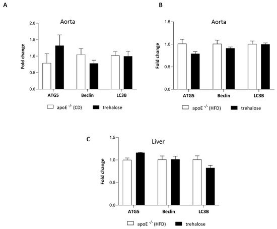 Influence of trehalose on autophagy in the aorta and liver of apoE−/− mice. Expression level of genes related to autophagy: ATG5, Beclin-1, and LC3B in the aorta of apoE−/− mice and trehalose-treated apoE−/− mice on a CD (A) and on an HFD (B) and in the liver of apoE−/− mice and trehalose-treated apoE−/− mice on na HFD (C) (mean ± SEM; n = 4–5 per group).