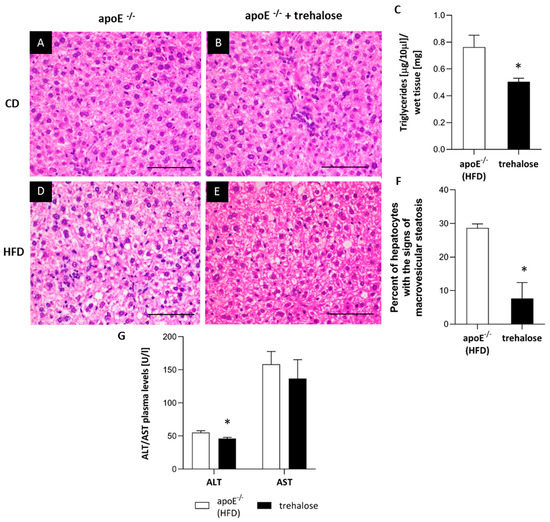 Influence of trehalose on hepatic steatosis in apoE−/− mice. Representative images of the livers of apoE−/− mice on a CD (A), trehalose-treated apoE−/− mice on a CD (B), apoE−/− mice on an HFD (D), and trehalose-treated apoE−/− mice on an HFD (E). The images show hematoxylin and eosin staining (A,B,D,E) and quantitative analysis of macrovesicular steatosis (C), as well as TG content in the liver (F) and plasma alanine aminotransferase (ALT)/ aspartate aminotransferase (AST) levels in apoE−/− mice and trehalose-treated apoE−/− mice on an HFD (G). Magnification 40x (mean ± SEM; * p < 0.05 as compared to apoE−/− mice on a HFD; n = 3 or n = 7 per group). Scale bars = 50 µm.
