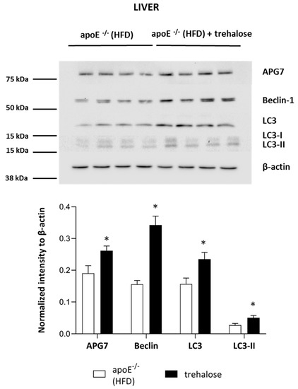To investigate the molecular mechanisms responsible for the reduction of hepatic steatosis upon trehalose treatment in the liver of apoE−/− mice on an HFD, we performed immunoblotting and real-time PCR of key factors related to autophagy: Beclin-1, microtubule-associated proteins 1A/1B light-chain 3B (LC3), and autophagy-related protein 7 (APG7). As compared to the untreated mice, the administration of trehalose resulted in a significant increase in the protein expression of Beclin-1, LC3, LC3-II, and APG7 in the liver of apoE−/− mice on an HFD (Figure 7). However, real-time PCR experiments did not reveal any significant change of expression of genes related to autophagy (LC3B, ATG5, Beclin) in the liver of apoE−/− mice on an HFD upon trehalose administration (Figure 5C).