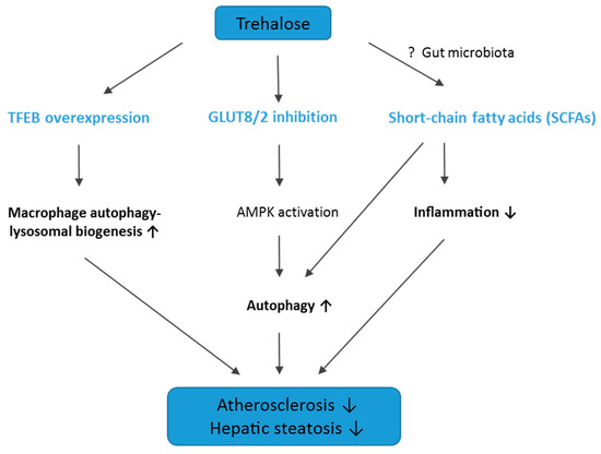 Graphical summary of the potential mechanisms of action of trehalose in atherosclerosis and hepatic steatosis. TFEB, transcription factor EB; GLUT8/2, glucose transporter 8/2; AMPK, AMP-activated protein kinase; SCFAs, short-chain fatty acids. ↑, upregulation; ↓, downregulation; ?, potentially involved pathway.