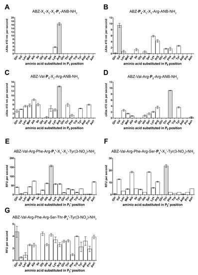 - Harris, J.L.; Backes, B.J.; Leonetti, F.; Mahrus, S.; Ellman, J.A.; Craik, C.S. Rapid and general profiling of protease specificity by using combinatorial fluorogenic substrate libraries. Proc. Natl. Acad. Sci. USA 2000, 97, 7754–7759. [Google Scholar] [CrossRef] [PubMed]