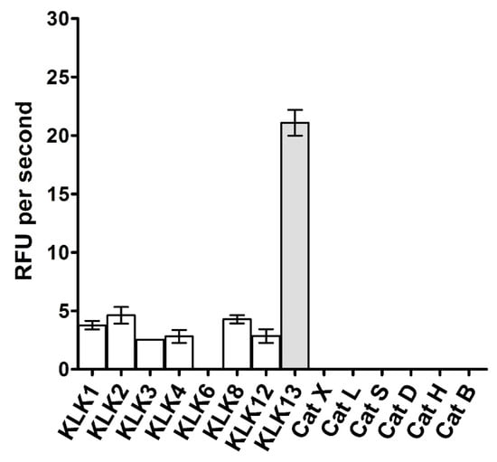 Selectivity of the optimized substrate 2 (ABZ-Val-Arg-Phe-Arg-Ser-Thr-Gln-Tyr(3-NO2)-NH2). Activity of selected kallikrein family proteases (KLK1, KLK2, KLK3, KLK4, KLK6, KLK8, KLK12, KLK13) and cathepsins (CatX, CatL, CatS, CatD, CatH, CatB) against the tested substrate was monitored at equal enzyme concentrations in the KLK13-optimized buffer. The fluorescence of the released ABZ-Val-Arg-Phe-Arg fragment was monitored at excitation and emission wavelengths 320 and 450 nm, respectively.