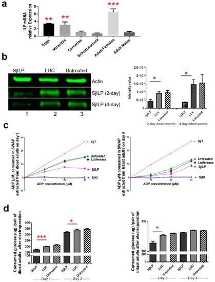 2.2. Reduction in SjILP Protein Expression in Adult Parasites Treated with SjILP dsRNA