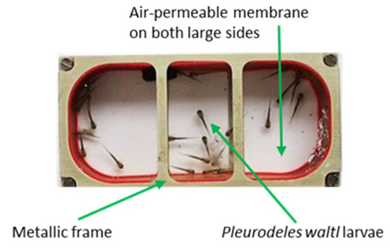 Different groups of P. waltl larvae at the same developmental stage were subjected, in parallel, to various environmental modifications similar to those encountered during a mission onboard the ISS or some combination thereof. These stressors were recreated in the laboratory to the best of our technical abilities and were applied for a maximum of 10 days. Experiments were performed on larvae, and not adults, because many of them can be accommodated in small aquaria (miniaquaria—Figure 1) conceived to allow amphibian embryo development onboard the ISS.