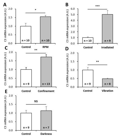 Effects of individual stressors, similar to those encountered during a stay in the ISS, on P. waltl complement C3 mRNA levels. Complement C3 mRNAs were quantified by RT-qPCR in larvae subjected to (A) simulated microgravity, (B) simulated ISS radiation environment, (C) confinement, (D) vibration, or (E) obscurity. Relative values obtained with unstressed controls were set to 1. Results are expressed as means ± SEM. “A.U.” stands for “arbitrary units”. Differences were found using Student’s t-tests or Mann—Whitney tests. * p < 0.05, ** p < 0.01, *** p < 0.001, NS., no statistical difference.