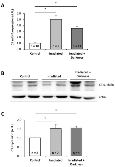 Effects of the combination of radiation and darkness on P. waltl complement C3 expression. (A) C3 mRNA were quantified by RT-qPCR. (B, C) C3 proteins were quantified by western blotting. Western blot results were visualized by chemiluminescence, analyzed by densitometry and normalized to α-actin. Relative values obtained with control larvae reared in a nonirratiated miniaquarium subjected to normal light conditions were set to one in (A) and (C). Results are expressed as means ± SEM. “A.U.” stands for “arbitrary units”. Differences were found using Kruskal–Wallis followed by a Dunn test. * p < 0.05, T indicates a tendency (statistically significant difference with a 10% alpha risk but not with a 5% alpha risk), NS., no statistical difference.
