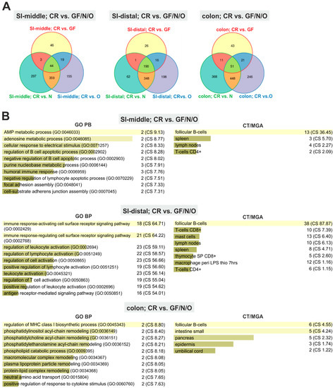 The immune system is not reconstituted upon monoassociation with a single E. coli strain. (A) Venn diagrams indicating numbers of gene probes differentially expressed in the middle (SI-middle) and distal (SI-distal) parts of the small intestine and in the colon of GF, N, and O animals when compared with CR mice (significance criterion: q < 0.05; |log FC| ≥ 1). The corresponding annotated genes are listed in Supplementary Table S2. (B) Genes expressed differentially in the analyzed groups of mice were analyzed using ‘Gene Ontology Biological Processes’ (GO BPs) and ‘Cell Types/Mouse Gene Atlas’ (CT/MGA) categories in Enricher datasets. The results were sorted according to the combined score (CS; CS is computed by multiplying the log of p-value obtained from the Fisher’s exact test by the z-score of the deviation from the expected rank). A maximum of ten GO BPs and CT/MGA categories containing at least two differentially expressed genes and with CS ≥ 1 is shown; the coloring of the columns corresponds to the significance of the individual columns in the graph. The number of genes in the particular category is indicated by the number before the parenthesis. |log FC|, absolute value of the binary logarithm of relative expression intensity.