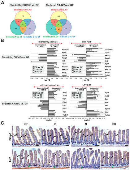A limited number of genes are uniquely expressed in the GF small intestine. (A) Venn diagrams comparing gene expression profiles in small intestinal segments of CR, N, and O animals when contrasted with the gene expression profile obtained in GF mice. Eleven gene probes (representing 10 annotated genes) and 9 gene probes (representing 8 annotated genes) were differentially expressed in the SI-middle or SI-distal segment, respectively (selection criterion: |log FC| ≥ 1; p < 0.05 in at least two of three comparisons). The genes are listed in Supplementary Table S3. (B) Validation of cDNA microarray by qRT-PCR. Diagrams depict expression analysis of the indicated genes performed by cDNA microarray hybridization (left) or by qRT-PCR (right). Normalized fluorescence signal obtained in the respective gene probe upon hybridization with RNA isolated from GF mice was set to 1. Results of qRT-PCR were normalized to ubiquitin B (Ubb); the expression level of the respective gene in the mucosa of GF mice was set to 1. Four mice from each group were analyzed. Error bars represent SDs. Corresponding CT values are listed in Supplementary Table S4; * p < 0.05; ** p < 0.01 [one-way Analysis of Variance (ANOVA) test]. (C) Immunohistochemical detection of Fkbp5 and Irs2 using 3,3’-diaminobenzidine (DAB) staining (brownish precipitate) in the SI-middle part using specimens obtained from animals of the indicated experimental group. Both proteins are mainly produced in epithelial cells (black arrows). In addition, prominent Irs2 staining was also observed in the smooth muscle layer (green arrows). Representative images of specimens counterstained with hematoxylin are shown. Scale bar: 0.15 mm.
