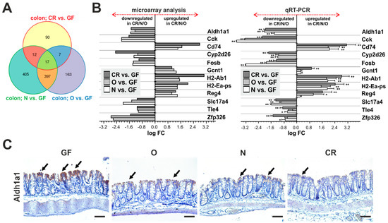 Aldh1a1 represents a robust marker of the GF colon. (A) A Venn diagram comparing gene expression profiles of the colonic mucosa of CR, N, and O animals when contrasted with the gene expression profile obtained in GF mice. According to the selection criterion (|log FC| ≥ 1; p < 0.05), 17 gene probes representing 12 annotated genes were identified. The genes are listed in Supplementary Table S3. (B) Validation of cDNA microarray by qRT-PCR. Comparison of expression analysis of the indicated genes performed by cDNA microarray hybridization (left) or by qRT-PCR (right). Samples obtained from four mice from each group were analyzed, as described in Figure 2B. Corresponding CT values are listed in Supplementary Table S4; * p < 0.05; ** p < 0.01 (one-way ANOVA test). (C) Immunohistochemical detection showing increased production of Aldh1a1 in differentiated epithelial cells (black arrows) of the colon of GF mice. Representative images of specimens counterstained with hematoxylin are shown. Scale bar: 0.15 mm.