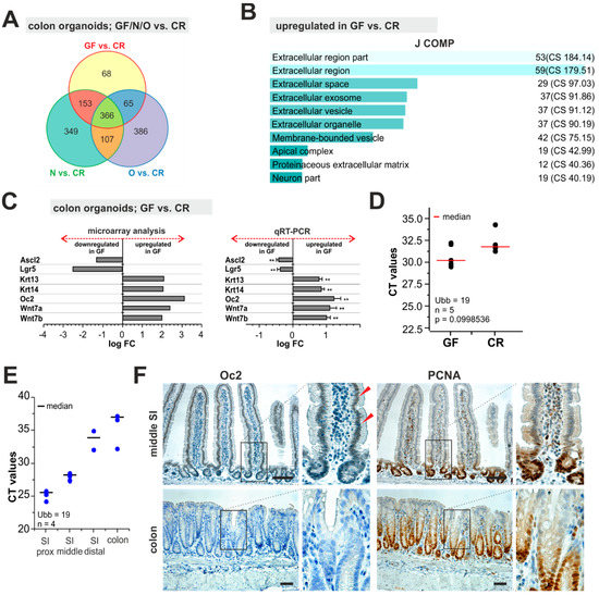Oc2 expression was elevated in organoids derived from the gnotobiotic colon (A) A Venn diagram comparing gene expression profiles of colon organoids derived from GF, N, and O animals when compared to colon organoids derived from CR mice; 366 gene probes representing 285 annotated genes were identified. The genes are listed in Supplementary Table S6. (B) Enricher analysis of 138 genes upregulated in GF vs. CR colon organoids. The diagram shows top ten categories of the Jensen Compartment (J COMP; https://compartments.jensenlab.org/Search). (C) Validation of cDNA microarray by qRT-PCR. Diagrams depict expression analysis of the indicated genes in GF vs. CR colon organoids performed by cDNA microarray hybridization (left) or by qRT-PCR analysis (right). Normalized fluorescence signal obtained in the respective gene probe upon hybridization with RNA isolated from CR mice was set to 1. Results of the qRT-PCR analysis were normalized to Ubb; the expression level of the respective gene in the mucosa of CR mice was set to 1. Organoids derived from at four two mice were used; qRT-PCR reactions were run in technical triplicates. Error bars represent SDs. Corresponding CT values are listed in Supplementary Table S4; ** p < 0.01 (one-way ANOVA test). (D) Expression of the Oc2 gene in the colon mucosa of CR and GF mice. Results were normalized to Ubb and the cycle threshold (CT) value of Ubb was arbitrarily set to 19. Five mice from each group were analyzed; median of CT values is indicated by a red line. The indicated p value was calculated using a one-way ANOVA test. (E) Oc2 expression levels along the rostro-caudal axis of the intestine. The diagram shows results of qRT-PCR using total RNA isolated from the mucosal scratches of the proximal (SI-prox), middle (SI-middle) and distal part (SI-distal) of the small intestine and from the middle portion of the colon of CR mice. Total RNA was obtained from 4 animals. Results were normalized to Ubb and the CT value of Ubb was arbitrarily set to 19; median of CT values is indicated by a grey line. (F) Immunohistochemical detection of Oc2 and proliferating cell nuclear antigen (PCNA) in the small intestine (jejunum) and middle part of the colon. The specimens were obtained from CR animals. Notice Oc2-positive cell nuclei in the small intestinal epithelial cells (red arrowheads). Specimens were counterstained with hematoxylin; boxed areas are magnified at the right. Scale bar: 0.15 mm.