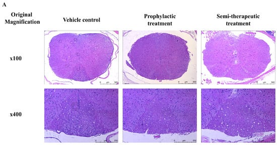 The cervical spinal cord was cross-sectioned at 5 μm thickness and stained with Hematoxylin and Eosin (H&E) and Luxol Fast Blue (LFB) for identification of parenchymal infiltrating mononuclear cells and myelin integrity [], respectively. The tissue sections were examined under a light microscope to evaluate demyelination and inflammatory cell infiltration in parenchymal cells of the spinal cord.