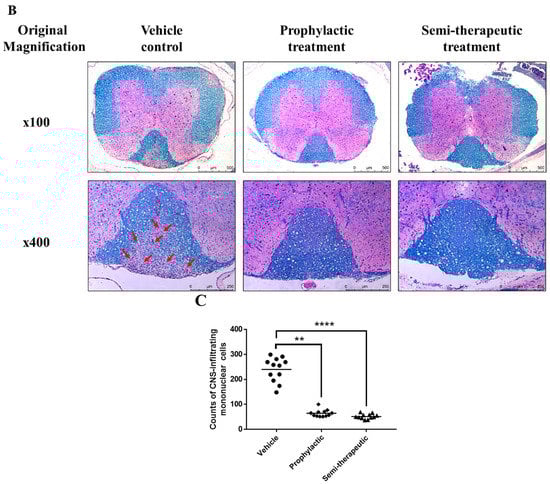 10 to 12-week-old C57BL/6J mice were immunized subcutaneously on day 0 with 100 μg/per mouse of MOG35–55 peptide emulsified in complete Freund’s adjuvant supplemented with 400 mg/mL Mycobacterium tuberculosis H37Ra (Difco, Kansas City, MO, USA) []. Each mouse was subsequently administered 250 ng pertussis toxin (List Biological Laboratories, Campbell, CA, USA) by intraperitoneal (i.p.) injection on days 0 and 2 after MOG35–55 peptide immunization. The EAE clinical manifestations were evaluated by daily assignment of scores from 0 to 5 as follows: 0, no clinical sign; 0.5, partial weakness of limb tail; 1, complete paralysis of tail; 1.5, paralysis of tail and waddling gait; 2, paralysis of one hind limb; 2.5, paralysis of one hind limb and partial paralysis of the other hind limb; 3, paralysis of both hind limbs; 3.5, forelimb weakness; 4, forelimb paralysis; 5, moribund or death.