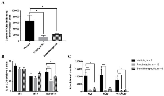 Several authors have vigorously proposed that the encephalitogenic Th1 and Th17 cells are to be blamed for the pathogenesis of EAE []. The most well-known advocating evidence of this statement is the development of Th1/Th17 CNS-infiltrating cells in the CNS and the causal exacerbation of EAE progression due to their presence []. In an attempt to examine the influence of dulaglutide on the development of proinflammatory T cell subsets in CNS, we isolated CNS-infiltrating mononuclear cells from the pooled brain and spinal cord samples and analyzed the percentages and absolute cell numbers of CD4-positive T cell subsets. We found that the absolute cell numbers of CD45hi–expressing CNS-infiltrating mononuclear cells were significantly lower in mice treated with prophylactic and semi-therapeutic dulaglutide administration than those mice treated with vehicle control (Figure 3A), respectively. Our data revealed that both percentages of Th1 and Th17 cells are statistically insignificant in the CNS of EAE mice that received the vehicle, prophylactic, or semi-therapeutic treatment, respectively. Nevertheless, the frequency of IFN-γ/IL-17A doubly-producing CD4+ T cell (Th1/Th17) subset was significantly declined in the CNS of MOG-immunized mice treated with prophylactic or semi-therapeutic dulaglutide administration as compared to vehicle control (Figure 3B). Mean fluorescence index (MFI) of cytokines in those T helper cells had no significant variation. The exploration that dulaglutide explicitly affects the development of Th1/Th17 cell subset without impairing the quantities of cytokine production in cells and no single populations brings to light the role of GLP1 in mitigating doubly Th1/Th17 immunomodulation. Moreover, we found that absolute cell numbers of Th1 and Th1/Th17 cells were drastically decreased in the CNS of EAE mice that received the administration of prophylactic or semi-therapeutic dulaglutide as compared to vehicle control, respectively (Figure 3C). Nevertheless, the cell number of encephalitogenic Th17 cells was only diminished when treated with prophylactic dulaglutide, but not semi-therapeutic group as compared to vehicle control, respectively (Figure 3C), highlights the importance of timing in GLP1 immunomodulation. Taken together, our results suggested that dulaglutide administration may regulate the differentiation of tissue-infiltrating Th1/Th17 cell subset and affect the numbers of encephalitogenic T cell subsets in the CNS of EAE mice.