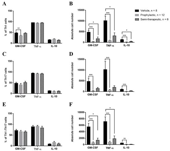 Prophylactic GLP-1 RA dulaglutide treatment strikingly diminishes the frequency of granulocyte-macrophage-colony-stimulating factor (GM-CSF)-producing encephalitogenic Th1 cell subset in the CNS of MOG-immunized mice. Frequency (A,C,E) and cell number (B,D,F) of GM-CSF-, Tumor necrosis factor α (TNF-α)-, or IL-10-producing in Th1 (A,B), Th17 (C,D), or Th1/Th17 (E,F) cells from CNS of EAE mice, respectively. MOG-immunized mice were treated with indicated regimens, including prophylactic (gray bar), semi-therapeutic (dotted bar) treatment, or vehicle control (black bar) treatment. At day 14 after MOG immunization, mononuclear cells were isolated from CNS of EAE mice and were analyzed by the procedure of intracellular cytokine staining. The data are representative of three independent experiments. All data for frequency and cell number were presented as mean ± SEM from, at least, 6 mice in each group. *** p < 0.001; ** p < 0.01; * p < 0.05 by the non-parametric Kruskal–Wallis test followed by post-hoc analysis, Dunn’s multiple comparisons test.