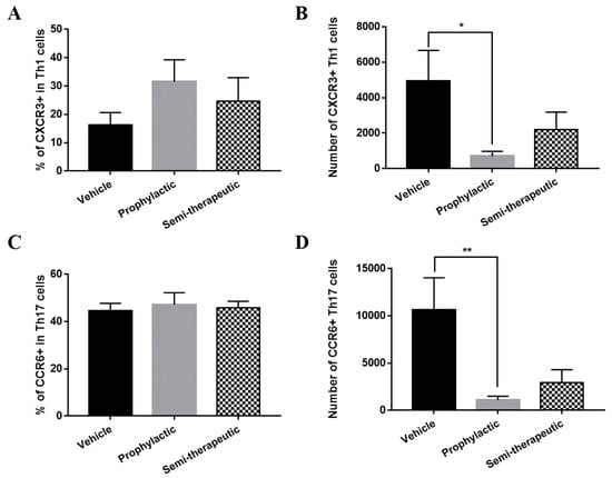 After establishing qualitatively and quantitatively the constitution and fidelity of T cell subset populations upon dulaglutide treatment, we wonder whether the effect of prophylaxis stems from T cell chemotaxis. Established by prior literatures, CXCR3 and CCR6 are crucial chemotactic factors for encephalitogenic Th1 and Th17 cell subset toward CNS [,]. To explore whether dulaglutide administration affected the chemotaxis of encephalitogenic Th1 and Th17 cells in the CNS lesion of EAE mice, we measured the frequencies of CXCR3 in Th1 cells and CCR6 in Th17 cells of the CNS from MOG-immunized mice with the treatment of vehicle control, prophylactic, or semi-therapeutic manner. Our results revealed nonsignificant alterations in the percentages of CXCR3 in encephalitogenic Th1 cells and CCR6 in Th17 cells (Figure 5A,C). In those Th1 and Th17 cells, the amounts of CXCR3 and CCR6 were the same from EAE mice treated with different regimens, respectively. These results shed light on the lack of involvement of GRP-1 signaling in the chemo-attractive migration of encephalitogenic T cell subsets and welcome an alternative mechanism. Nevertheless, when comparing the cell numbers of CXCR3-positive Th1 and CCR6-positive Th17 in the CNS of EAE mice upon the treatment of vehicle control, prophylactic, or semi-therapeutic dulaglutide; Figure 5B,D showed that prophylactic but not semi-therapeutic dulaglutide administration significantly decreased the absolute numbers of CXCR3-positive Th1 cells and CCR6-positive Th17 cells in the CNS of EAE mice, despite constant frequencies of these subsets. The exploration on the grounds of chemotaxis, overall, emphasized the absence of GRP-1 engagement by revealing that dulaglutide administration does not regulate the migration potential of encephalitogenic T cells into the CNS to elicit the pathogenic progression of autoimmune encephalomyelitis.