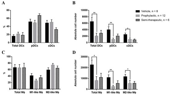 DCs and macrophages are key antigen-presenting cells (APCs) during the pathogenesis of EAE [,,]. To simulate the real-life situation of an orchestrated immune response, we measured the percentage and absolute numbers of DCs and macrophages in the CNS of EAE mice with the treatment of vehicle control, prophylactic, or semi-therapeutic dulaglutide administration. We found that dulaglutide treatments had no effect on the percentages of DCs subsets, as compared to vehicle control (Figure 6A). However, our results emphasized that the absolute numbers of total DCs (I-A/I-E+/F4/80-/CD11b+/CD11c+), plasmacytoid DCs (pDCs, I-A/I-E+/F4/80-/CD11b+/CD11c+/B220+), or classic DCs (cDCs, I-A/I-E+/F4/80-/CD11b+/CD11c+/B220-) were strikingly decreased in the CNS of MOG-immunized mice with the administration of prophylactic but not semi-therapeutic dulaglutide treatment as compared to vehicle control, respectively (Figure 6B), insinuating that dulaglutide administration might influence the DCs populations in the CNS of EAE mice to enhance the encephalitogenicity of T cell subsets. Moreover, we also measured the percentage and cell number of total macrophages (I-A/I-E+/F4/80+/CD11b+), M1-like (I-A/I-E+/F4/80+/CD11b+/CD11c+), or M2-like (I-A/I-E+/F4/80+/CD11b+/CD11c-) macrophages in the CNS of EAE mice upon treatment of vehicle control, prophylactic, or semi-therapeutic dulaglutide, respectively. The percentages of macrophage subsets were similar among mice received different regimens (Figure 6C), respectively. We found that prophylactic dulaglutide treatment significantly reduced the cell numbers of total, M1-like macrophages, and M2-like macrophages in the CNS (Figure 6D). Nevertheless, semi-therapeutic dulaglutide treatment failed to affect the development of macrophages in CNS of EAE mice, as compared to vehicle control (Figure 6D). Taken together, these findings support that dulaglutide may have a modulatory effect in the regulation of DCs and macrophages in the CNS during the pathogenesis of autoimmune encephalomyelitis.