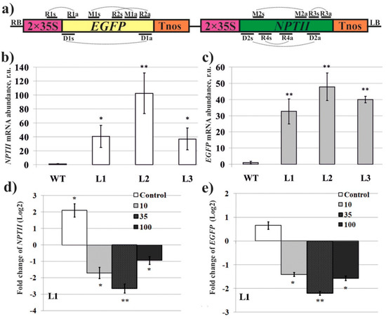 - Koscianska, E.; Kalantidis, K.; Wypijewski, K.; Sadowski, J.; Tabler, M. Analysis of RNA silencing in agroinfiltrated leaves of Nicotiana benthamiana and Nicotiana tabacum. Plant Mol. Biol. 2005, 59, 647–661. [Google Scholar] [CrossRef]