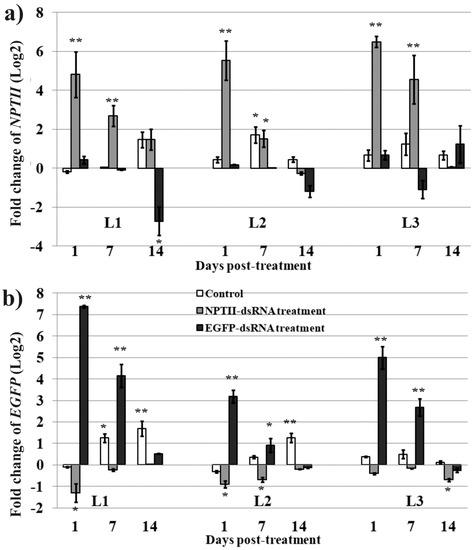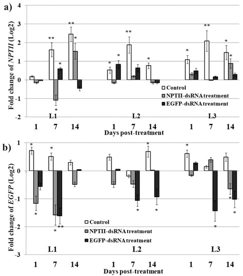 | NPTII-dsRNA (before) NPTII-dsRNA (7 dpa) | 65.2 ± 5.9 | 62.2 ± 3.3 | 59.3 ± 4.3 | |