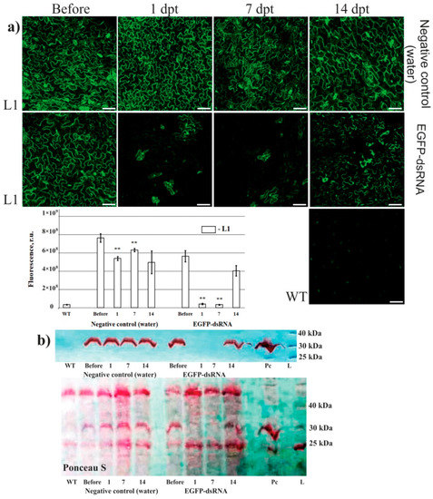 | EGFP-dsRNA (before) EGFP-dsRNA (7 dpa) | 59.9 ± 4.2 | 56.1 ± 3.8 | 54.1 ± 3.2 | |