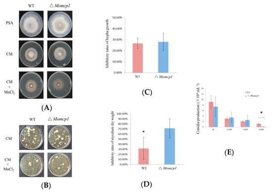 In order to determine whether the ∆Momcp1 mutant was sensitive to Mn2+, we compared the colony growth under the Mn2+ treatment. There were no significant differences in the inhibitory rates between the WT and ∆Momcp1 mutant, but the thinner mycelium was observed in the mutant (Figure 1A,C). Therefore, we used the liquid complete medium (CM) culture, adding Mn2+, to assess the mycelium development and dry weight. The ∆Momcp1 mutant showed less and smaller mycelium under the Mn2+ treatment compared with WT. Furthermore, the dry weight of the ∆Momcp1 mutant was significantly reduced (Figure 1B,D). Similarly, we found that the conidial production ability in the ∆Momcp1 mutant was decreased significantly under Mn2+ stress (Figure 1E). These results indicated that the ∆Momcp1 mutant is more sensitive to Mn2+.