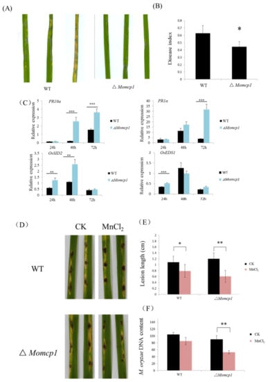 The pathogenicity of the ∆Momcp1 mutant was performed by conidia spay method. The lesions caused by the mutant showed fewer numbers and smaller areas compared with WT (Figure 2A,B). We used real-time quantitative PCR (RT-qPCR) to assess the expressions of defense related genes in rice with the ∆Momcp1 mutant inoculation (Figure 2C). The expressions of OsEDS1 and OsSID2 were significantly increased in rice infected with the ∆Momcp1 mutant at 24 hpi (hour post inoculation). Similarly, the expression of the other two genes, PR1a and PR10a, was also increased significantly at 48 hpi and 72 hpi. Thus, the expressions of defense related genes were increased in rice after the ∆Momcp1 mutant infection. To determine the direct effect of Mn2+ on fungal infection, we performed the punch inoculation with two strains under Mn2+ treatment on detached leaves. The length and biomass of the two strains were both decreased (Figure 2D–F), while the pathogenicity of ∆Momcp1 was significantly reduced compared with WT. These results showed that excessive Mn2+ disrupts the fungal pathogenicity, especially for ∆Momcp1.