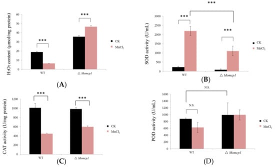 The changes of H2O2 contents and activities of antioxidant enzymes in the WT and ∆Momcp1 mutant under 2 mM Mn2+ treatment. (A) H2O2 contents. (B) SOD activity. (C) CAT activity. (D) POD activity. Each bar represents the means ± SD of three independent experiments. The significant differences were determined by Tukey-HSD test; ***, p < 0.001; N.S, no significance.