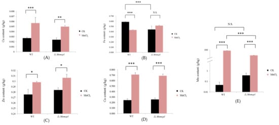We used Inductively Coupled Plasma Optical Emission Spectrometry (ICP-OES) to determine the changes of the intracellular metal contents including Mn, Cu, Zn, Fe, and Ca under the Mn2+ treatment. However, the contents of Cu, Zn, Ca and Mn were significantly increased both in the WT and ∆Momcp1 mutant (Figure 5A,C–E), and the Mn content in the WT was higher than in the ∆Momcp1 mutant, implying that the sensitive strain possessed a smaller amount of Mn. Meanwhile, the content of Fe in the WT was reduced but the ∆Momcp1 mutant showed no significant change under the Mn2+ treatment (Figure 5B). Therefore, the different changes of various metals between the WT and ∆Momcp1 mutant indicated that the blast fungus could modulate the contents of different metals under Mn2+ stress.
