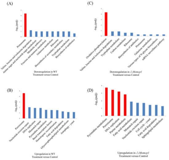 The KEGG pathways in WT and ∆Momcp1. (A) Down-regulation and (B) up-regulation of pathways in WT under 2mM Mn2+; (C) Down-regulation and (D) up-regulation of pathways in ∆Momcp1 under 2mM Mn2+.