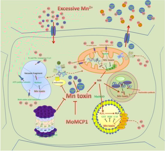 According to our transcriptome analysis, the expressions of many genes were regulated in the ∆Momcp1 mutant, but whether there are direct roles between MoMCP1 and Mn2+ needs to be proved in the future. Furthermore, we used a transcriptomics analysis to find the DEGs, but whether these DEGs are really responsible for targeted pathways or organelles requires other evidence such as an ultrastructure observation, along with physiological and metabolic experiments. Therefore, our results provide more information about Mn regulating network in rice blast fungi (Figure 9) and references for Mn induced diseases in humans.
