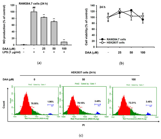 Effects of DAA on NO production and cytotoxicity. (a) DAA (0–100 µM) was pre-treated for 30 min, and LPS (1 µg/mL) was treated on RAW264.7 cells for 24 h. Cell supernatants were collected, and the production of NO was measured by Griess assay. (b) Cytotoxicity of DAA in RAW264.7 cells and HEK293T cells. Cells were incubated with DAA (0–100 µM) for 24 h, and then conventional MTT assay was performed. ## p < 0.01 compared to the normal group, ** p < 0.01 compared to the induced group. (c) Cytotoxicity of DAA in HEK293T cells was examined by PI staining analysis. The percentage of cell death was analyzed by flow cytometry.
