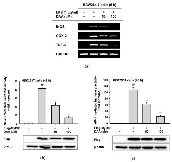 Effect of DAA on inflammatory transcriptional activation. (a) RAW264.7 cells were incubated with DAA (0–100 µM) in the presence or absence of LPS (1 µg/mL) for 6 h. Total mRNA was prepared from cells using Trizol methods, described in the Materials and Methods section. mRNA levels of inducible nitric oxide (iNOS), cyclooxygenase (COX)-2, and tumor necrosis factor (TNF)-α were determined by semiquantitative PCR. (b,c) Flag-MyD88 was transfected into HEK293T cells using polyethylenimine (PEI) with nuclear factor (NF)-κB-Luc or activator protein (AP)-1-Luc constructs, respectively. β-galactosidase plasmid was used as a control. DAA was treated for an additional 24 h, and luciferase activity was measured by a luminometer. The expression level of Flag-MyD88 (Lower panels of b and c) was examined by Western blotting. Antibodies against Flag and β-actin were used. Relative intensity (b,c) was values of the ratios calculated using densitometric scanning values of tagging protein (Flag) and densitometric scanning values of β-actin by the DNR Bio-imaging system (Gelquant software Version 2.7). ## p < 0.01 compared to the normal group, ** p < 0.01 compared to the induced group.
