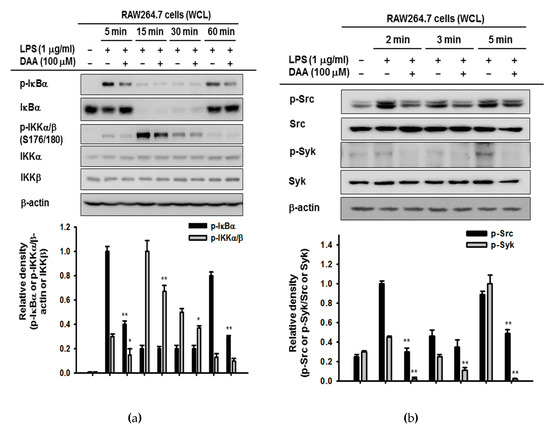 Effect of DAA in the NF-κB signaling cascade. (a,b) RAW264.7 cells were pre-treated with DAA, and LPS was applied in a time-dependent manner. Whole cell lysates were prepared, and immunoblotting was performed. Antibodies against phosphorylated or total IκBα, IKKα/β (serine 176/180), Src, Syk, and β-actin were used. (c,d) Myc-Syk or human influenza hemagglutinin (HA)-Src plasmids were transfected into HEK293T cells for 24 h, and then DAA (0–100 µM) was applied for an additional 24 h. Phosphorylated Syk and Src, Myc, HA, and β-actin were detected in whole cell lysates by immunoblotting. (e) (4-amino-5-(4-chlorophenyl)-7-(t-butyl) pyrazolo[3,4-d]pyrimidine) (PP2) or piceatannol (0–20 µM) was pre-treated on RAW264.7 cells for 30 min, and LPS (1 µg/mL) was treated for additional 24 h. NO production was determined by Griess assay. (f) Cytotoxicity of PP2 or piceatannol on RAW264.7 cells was examined by MTT assay. WCLs: whole cell lysates. Relative intensity (b,c) was the calculated ratio using densitometric scanning values of phospho-proteins and densitometric scanning values of β-actin or total forms of proteins from blots observed with independent repeats (n = 3) by the DNR Bio-imaging system (Gelquant software Version 2.7). * p < 0.05 and ** p < 0.01 compared to the induced group.