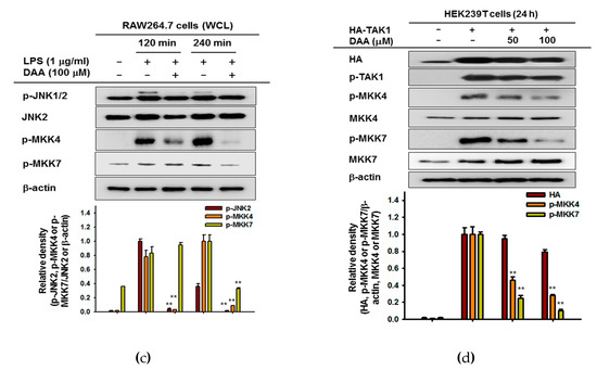 Effect of DAA on the AP-1 cascade. (a–c) DAA-pre-treated RAW264.7 cells were exposed to LPS (1 µg/mL) time-dependently, and whole-cell lysates were prepared. Phosphorylated or total levels of p38, c-Jun N-terminal kinase (JNK), extracellular signal-regulated kinase (ERK). mitogen-activated protein kinase kinase 4 (MKK4), MKK7, transforming growth factor beta-activated kinase 1 (TAK1), and β-actin were determined by immunoblotting. (d) TAK1-transfected HEK293T cells were treated with DAA (0–100 µM) for 24 h. Whole-cell lysates of cells were prepared, and phosphorylated or total forms of TAK1, MKK4, MKK7, HA, and β-actin were detected by immunoblotting. Relative intensity (b,c) was the calculated ratio using densitometric scanning values of phospho-proteins and densitometric scanning values of β-actin, HA or total forms of proteins from blots observed with independent repeats (n = 3) by the DNR Bio-imaging system (Gelquant software Version 2.7). ** p < 0.01 compared to the induced group.