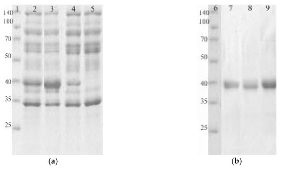 The SDS-PAGEs of culture fluids containing the recombinant EGLII forms (a) and purified enzymes (b). Lanes 1 and 6 are markers (kDa); lane 2 is the EGLII-DSB2 recombinant strain; lane 3 is the EGLII-DSB3 recombinant strain; lane 4 is the EGLII-wt recombinant strain; lane 5 is the control strain (PCA-10); lane 7 is EGLII-DSB2; lane 8 is EGLII-DSB3; and lane 9 is EGLII-wt.
