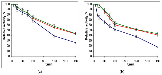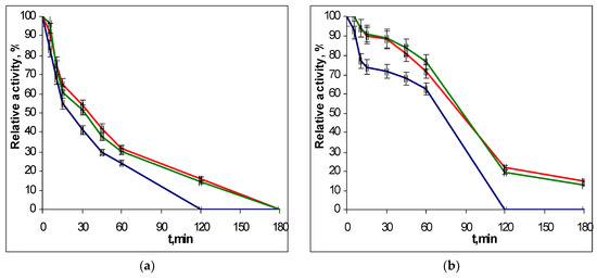The thermoinactivation of EGLII-wt (blue line) and its DSB2 (red) and DSB3 (green) variants at pH 5.0 and 80 °C: (a) Residual activity against CMC and (b) the residual activity against β-glucan. The enzyme initial activity is taken as 100%.