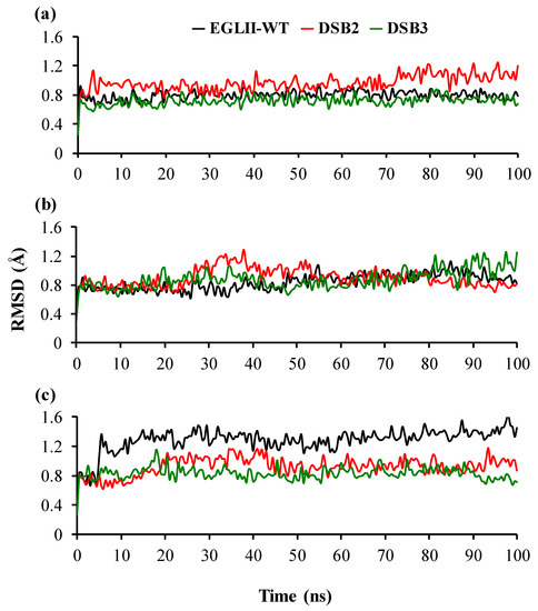 The structural stability of the EGLII forms based on RMSD: (a,b) At 26.85 and 70 °C, the RMSD of the backbone indicated that the DSB2 and DSB3 variants and EGLII-wt had similar structural stabilities. (c) At 80 °C, the RMSD of the backbone of EGLII-wt showed an instability, whereas the structures of the DSB2 and DSB3 variants remained stable.