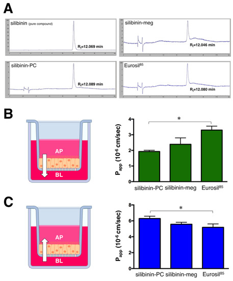 Papp values of the different formulations of silibinin. Representative HPLC elution profiles and retention times of silibinin formulations after 120 min incubation with the Caco-2 cell monolayers (A). Papp values in cm/s for silibinin formulations in both AP–BL (B) and BL–AP (C) directions. Each column represents the mean ± standard deviation (SD) of Papp values obtained in n = 6 independent replicates. * One-way ANOVA p < 0.0001; AP: Apical; BL: Basolateral; silibinin-PC: silibinin-phosphatidylcholine; silibinin-meg: silibinin-meglumine).
