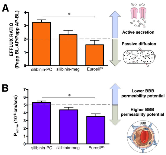Transport ratios of the different formulations of silibinin. (A) Efflux ratio (Papp) BL–AP/Papp AP–BL). (B) Blood–brain barrier (BBB) permeability-related Pactive ratio ([Papp BL–AP − Papp AP–BL]/2). * One-way ANOVA p < 0.0001; silibinin-PC: silibinin-phosphatidylcholine; silibinin-meg: silibinin-meglumine.