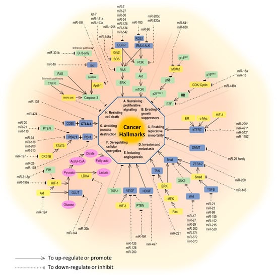 The development and behavior of cancer are complex. In 2000, Hanahan et al. comprehensively illustrated six hallmark capabilities of cancer, including sustaining proliferative signaling, evading growth suppressors, activating invasion and metastasis, enabling replicative immortality, inducing angiogenesis, and resisting cell death. A decade later, Hanahan and coworkers extended the original six hallmarks to eight, by adding avoiding immune destruction and dysregulating cellular energetics. Additionally, promoting inflammation with genome instability and mutation are thought to be two enabling characteristics of tumors by Hanahan et al. []. For each process in cancer biology, interaction between genetic preconditions and epigenetic alterations are equally important. Here, we will focus on the miRNAs involved in each hallmark capability. A brief summary of miRNAs and their associated pathways are outlined in Figure 1.